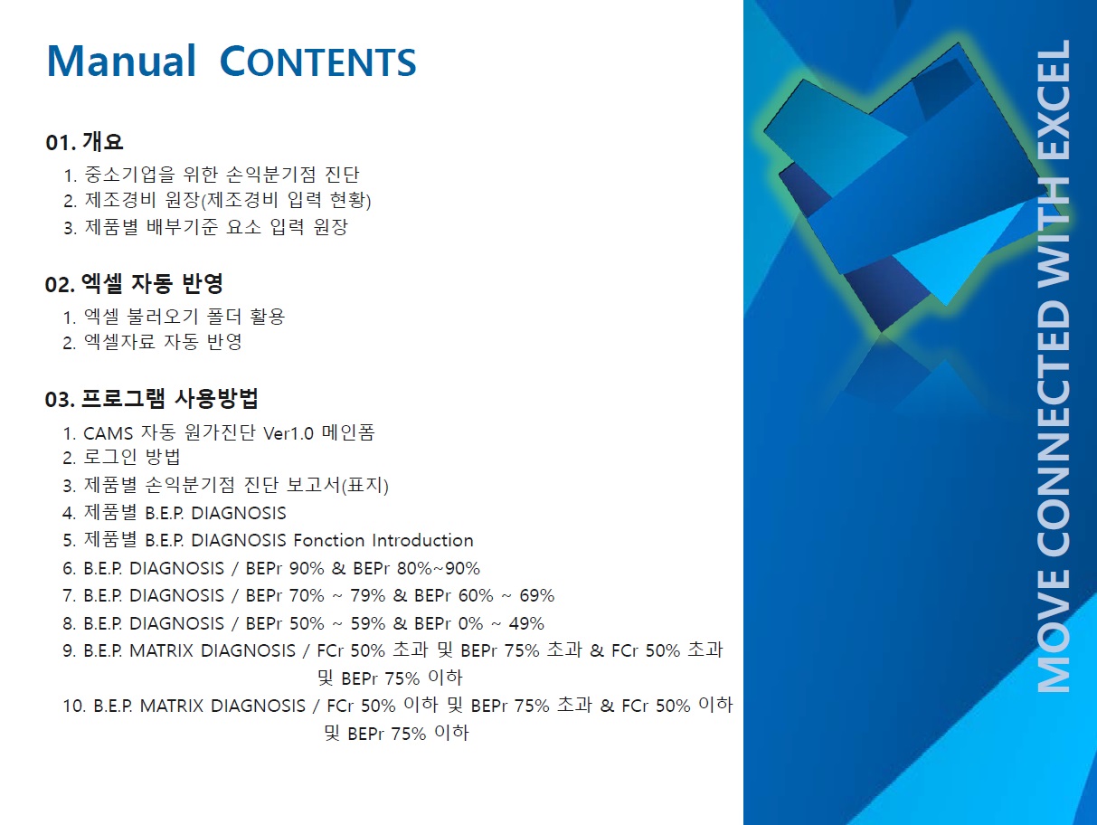 이러한 문제점들을 해결하고자 제조경비에 대한 엑셀 원장만으로 자동화하여 읽어 들여 간접경비에 대한 원가배분, 제품별 변동원가 및 고정원가의 자동분류, 제품별 손익분기점 자동 계산, 제품별 4분면 자동 MATRIX분류, 제품별 손익분기점 계산에 따른 자동 점수 계산, 점수에 따른 진단 및 개선안등을 보고서의 형태로 보여 줄 수 있는 프로그램을 개발하게되었습니다.