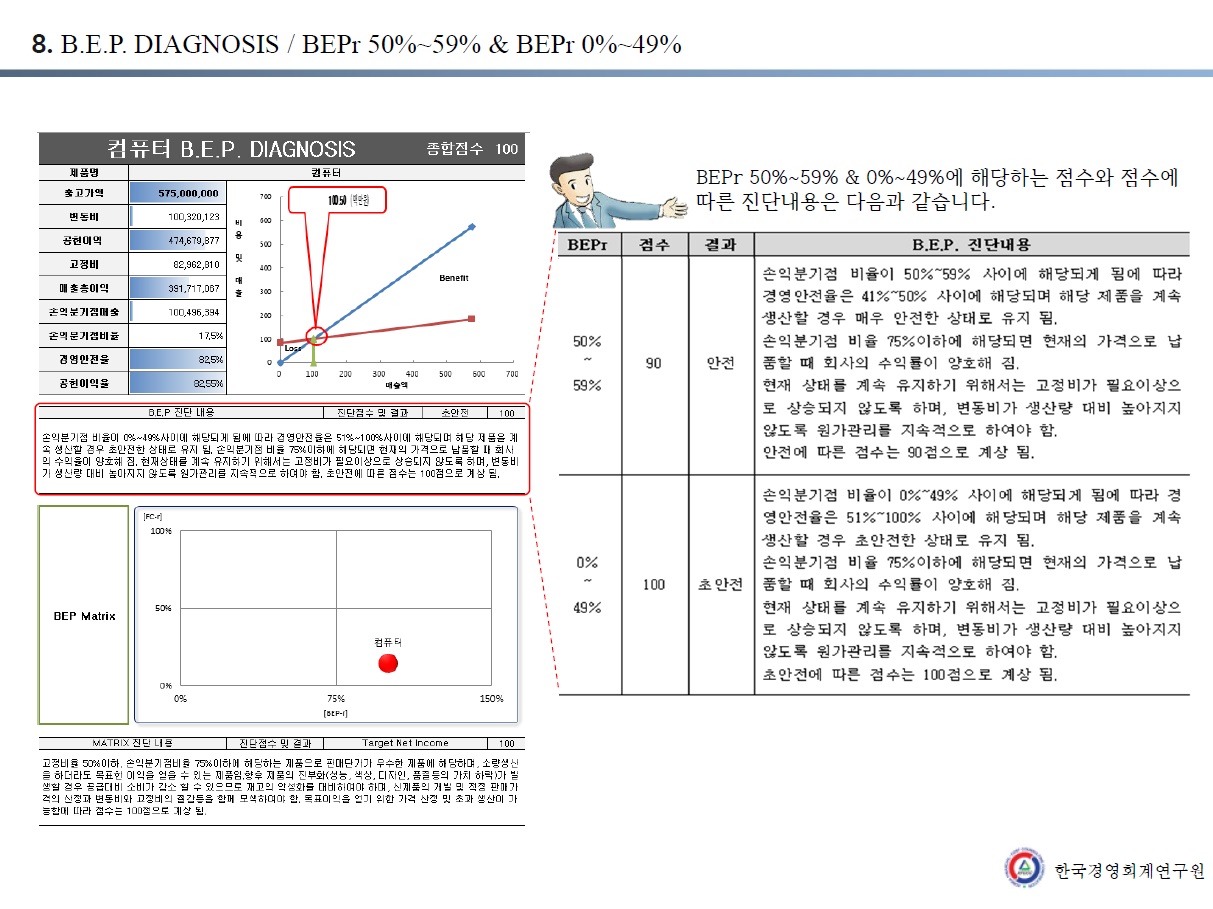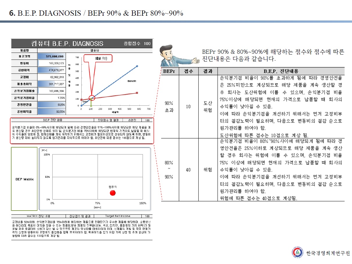 제품별 손익분기점 진단 보고서와 BEP CHART 및 MATRIX표를 함께 볼 수 있도록 구성하였으며, 손익분기점 진단에 따른 점수와 MATRIX진단에 따른 점수를 각각 확인하여 볼 수 있도록 하였습니다.