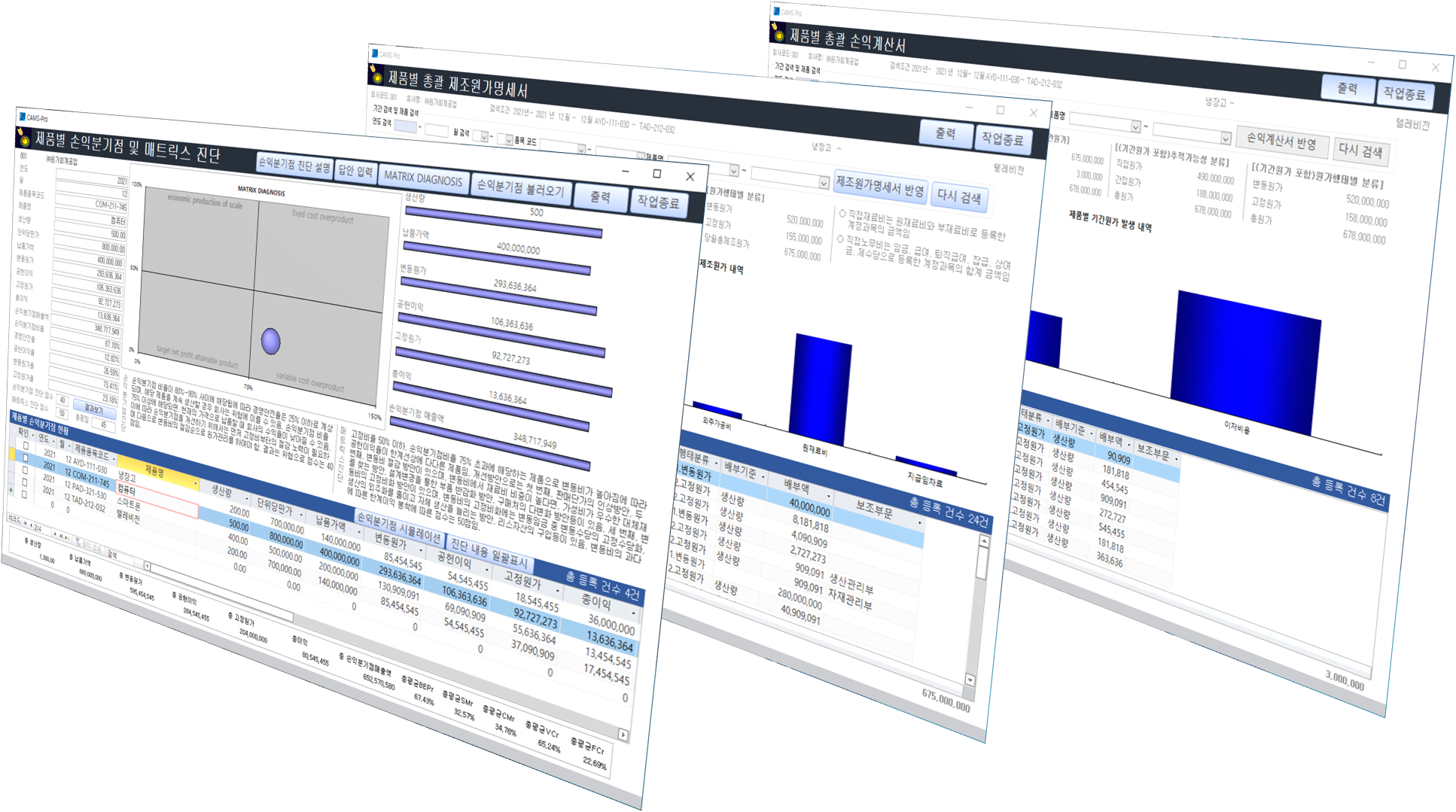CAMS로 제품별 원가 분석, 제품별 영업이익 분석, 손익분기점 분석